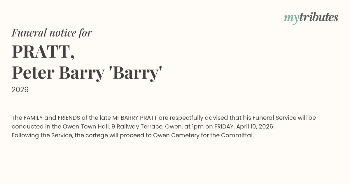18°CThe FAMILY and FRIENDS of the late Mr BARRY PRATT are respectfully advised that his Funeral Service will be conducted in the Owen Town Hall, 9 Railway Terrace, Owen, at 1pm on FRIDAY, April 10, 2026.
