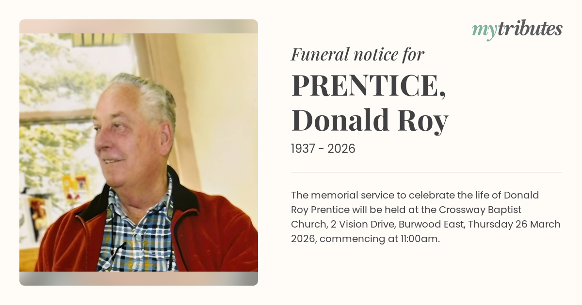 18°CThe memorial service to celebrate the life of Donald Roy Prentice will be held at the Crossway Baptist Church, 2 Vision Drive, Burwood East, Thursday 26 March 2026, commencing at 11:00am.