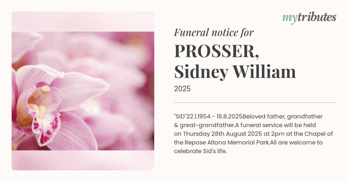 A funeral service will be held on Thursday 28th August 2025 at 2pm at the Chapel of the Repose Altona Memorial Park.