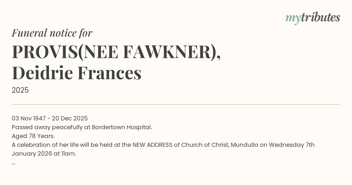 A celebration of her life will be held at the NEW ADDRESS of Church of Christ, Mundulla on Wednesday 7th January 2026 at 11am.