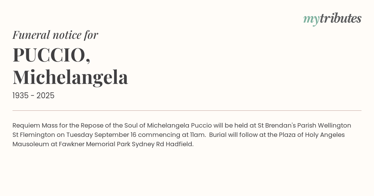 18°CRequiem Mass for the Repose of the Soul of Michelangela Puccio will be held at St Brendan's Parish Wellington St Flemington on Tuesday September 16 commencing at 11am. Burial will follow at the Plaza of Holy Angeles Mausoleum at Fawkner Memorial Park Sydney Rd Hadfield.