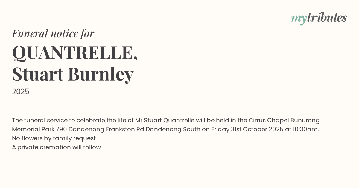 18°CThe funeral service to celebrate the life of Mr Stuart Quantrelle will be held in the Cirrus Chapel Bunurong Memorial Park 790 Dandenong Frankston Rd Dandenong South on Friday 31st October 2025 at 10:30am.
