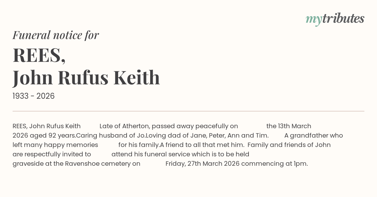Late of Atherton, passed away peacefully on the 13th March 2026 aged 92 years.