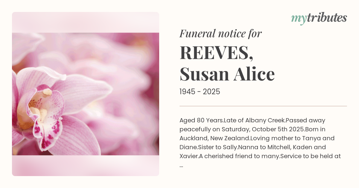 Service to be held at Albany Creek Memorial Park on Tuesday, October 14th 2025. Please wear a touch of pink.