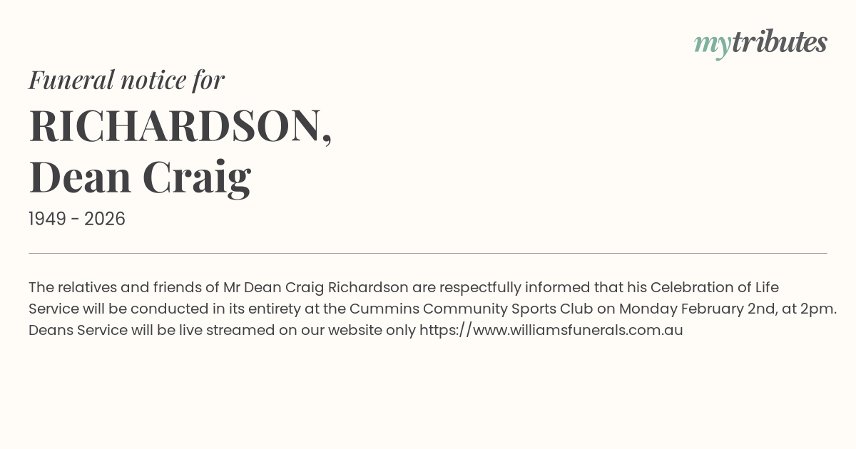 18°CThe relatives and friends of Mr Dean Craig Richardson are respectfully informed that his Celebration of Life Service will be conducted in its entirety at the Cummins Community Sports Club on Monday February 2nd, at 2pm.