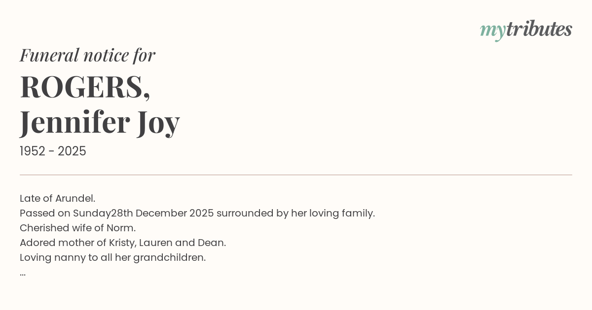 A celebration of Jennifer's life is to held on Monday 12th January at 12.30pm at the Somerville Funerals Nerang Chapel, 129 Nerang Broadbeach Road, Nerang, Queensland,4211.