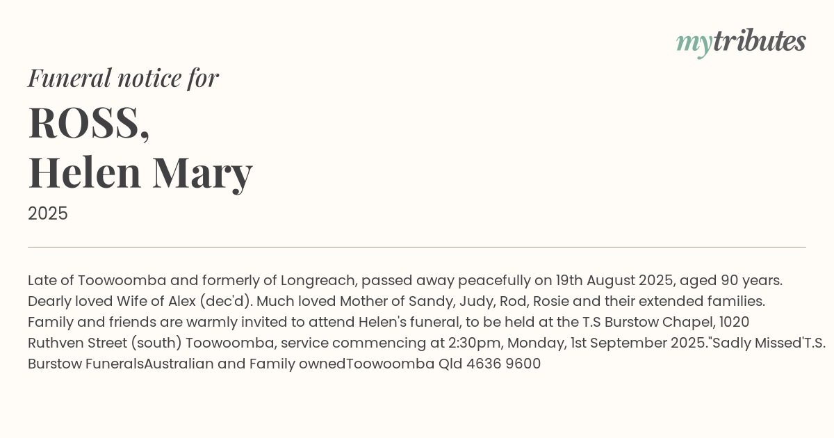 Family and friends are warmly invited to attend Helen's funeral, to be held at the T.S Burstow Chapel, 1020 Ruthven Street (south) Toowoomba, service commencing at 2:30pm, Monday, 1st September 2025.