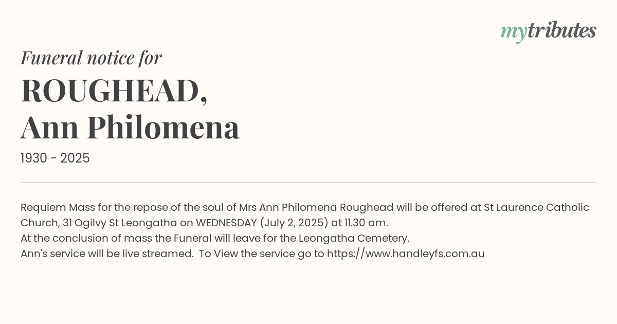 18°CRequiem Mass for the repose of the soul of Mrs Ann Philomena Roughead will be offered at St Laurence Catholic Church, 31 Ogilvy St Leongatha on WEDNESDAY (July 2, 2025) at 11.30 am.