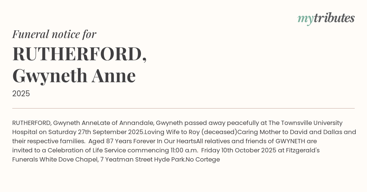 All relatives and friends of GWYNETH are invited to a Celebration of Life Service commencing 11:00 a.m. Friday 10th October 2025 at Fitzgerald's Funerals White Dove Chapel, 7 Yeatman Street Hyde Park.