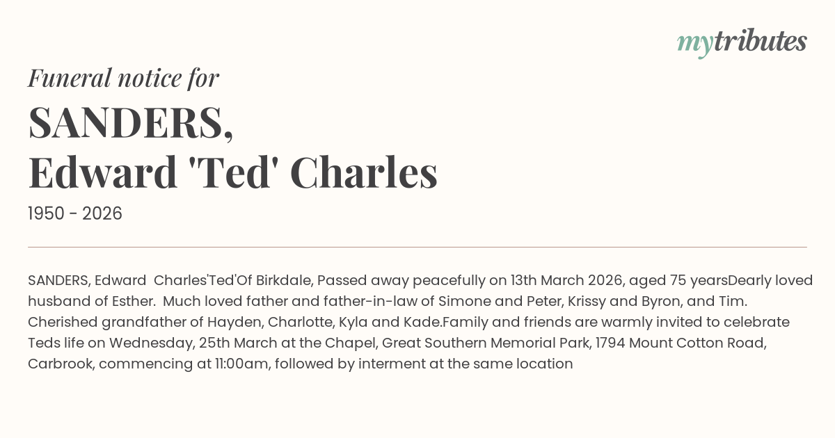 Family and friends are warmly invited to celebrate Ted’s life on Wednesday, 25th March at the Chapel, Great Southern Memorial Park, 1794 Mount Cotton Road, Carbrook, commencing at 11:00am, followed by interment at the same location