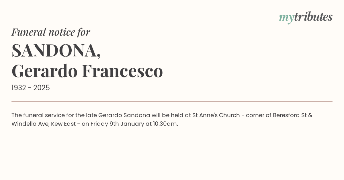 18°CThe funeral service for the late Gerardo Sandona will be held at St Anne's Church - corner of Beresford St & Windella Ave, Kew East - on Friday 9th January at 10.30am.