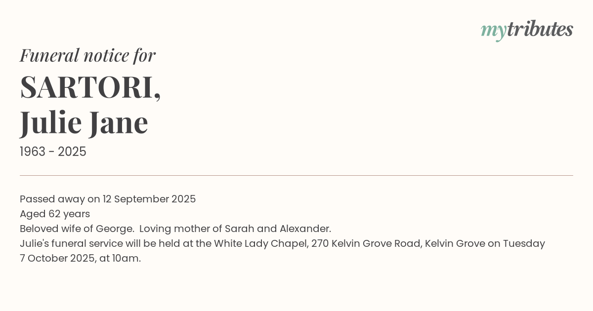 Julie's funeral service will be held at the White Lady Chapel, 270 Kelvin Grove Road, Kelvin Grove on Tuesday 7 October 2025, at 10am.