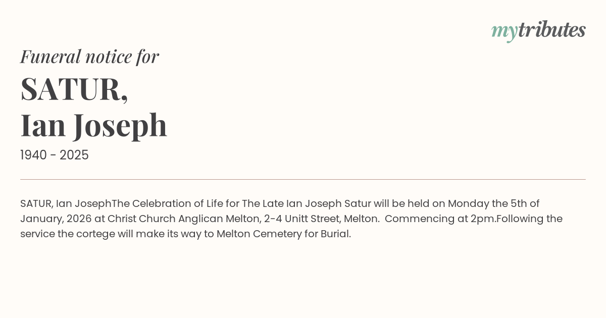 The Celebration of Life for The Late Ian Joseph Satur will be held on Monday the 5th of January, 2026 at Christ Church Anglican Melton, 2-4 Unitt Street, Melton. Commencing at 2pm.