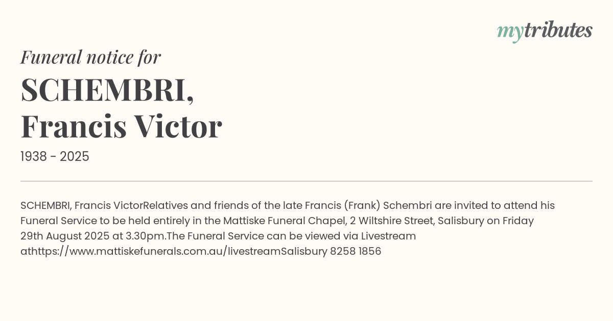 Relatives and friends of the late Francis (Frank) Schembri are invited to attend his Funeral Service to be held entirely in the Mattiske Funeral Chapel,