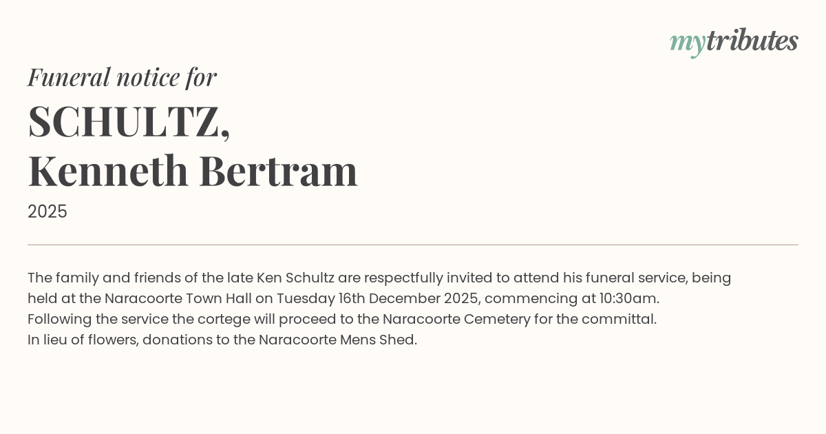 18°CThe family and friends of the late Ken Schultz are respectfully invited to attend his funeral service, being held at the Naracoorte Town Hall on Tuesday 16th December 2025, commencing at 10:30am.