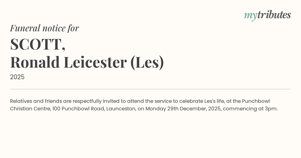 18°CRelatives and friends are respectfully invited to attend the service to celebrate Les's life, at the Punchbowl Christian Centre, 100 Punchbowl Road, Launceston, on Monday 29th December, 2025, commencing at 3pm.