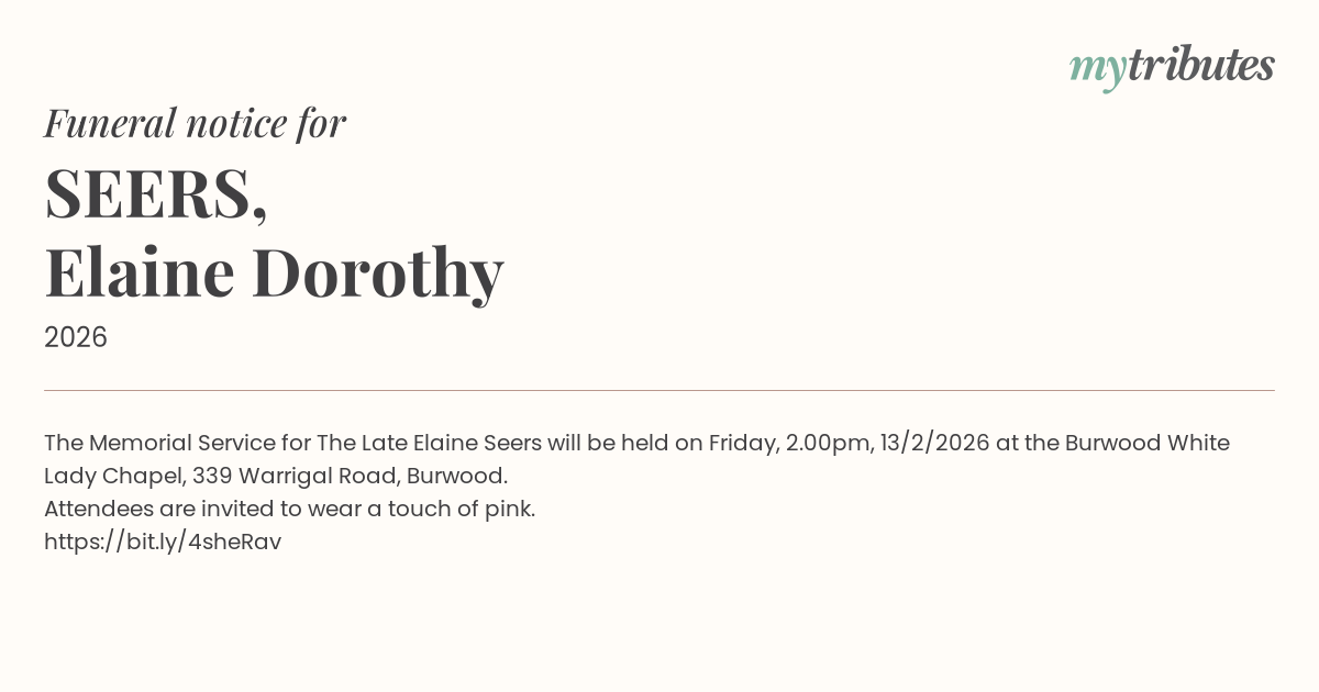 18°CThe Memorial Service for The Late Elaine Seers will be held on Friday, 2.00pm, 13/2/2026 at the Burwood White Lady Chapel, 339 Warrigal Road, Burwood.