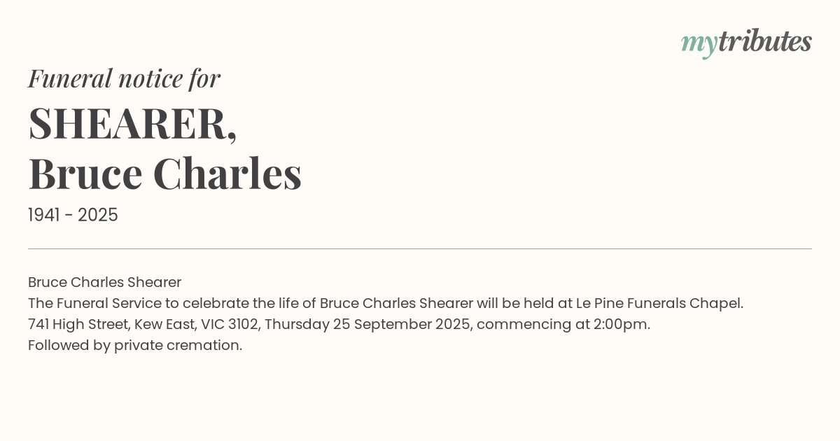 The Funeral Service to celebrate the life of Bruce Charles Shearer will be held at Le Pine Funerals Chapel.