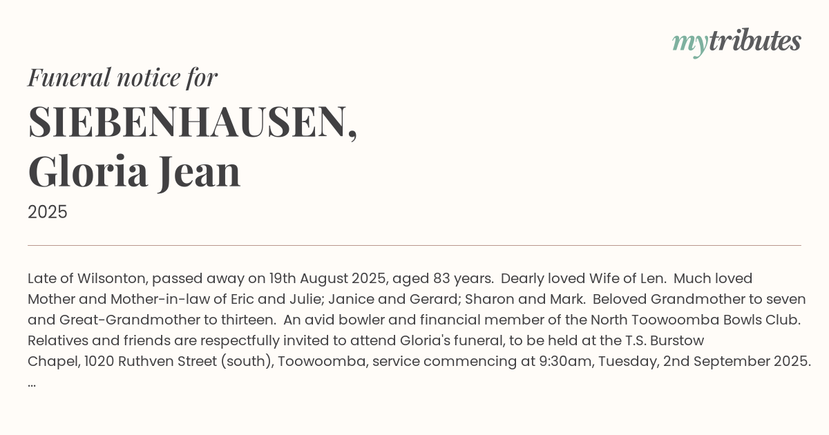 Relatives and friends are respectfully invited to attend Gloria's funeral, to be held at the T.S. Burstow Chapel, 1020 Ruthven Street (south), Toowoomba, service commencing at 9:30am, Tuesday, 2nd September 2025.