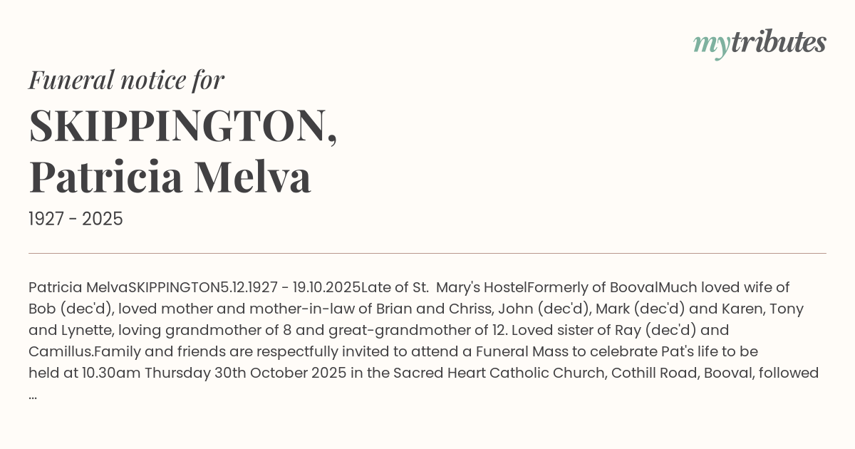 Family and friends are respectfully invited to attend a Funeral Mass to celebrate Pat's life to be held at 10.30am Thursday 30th October 2025 in the Sacred Heart Catholic Church, Cothill Road, Booval, followed by interment in the Warrill Park Lawn Cemetery.