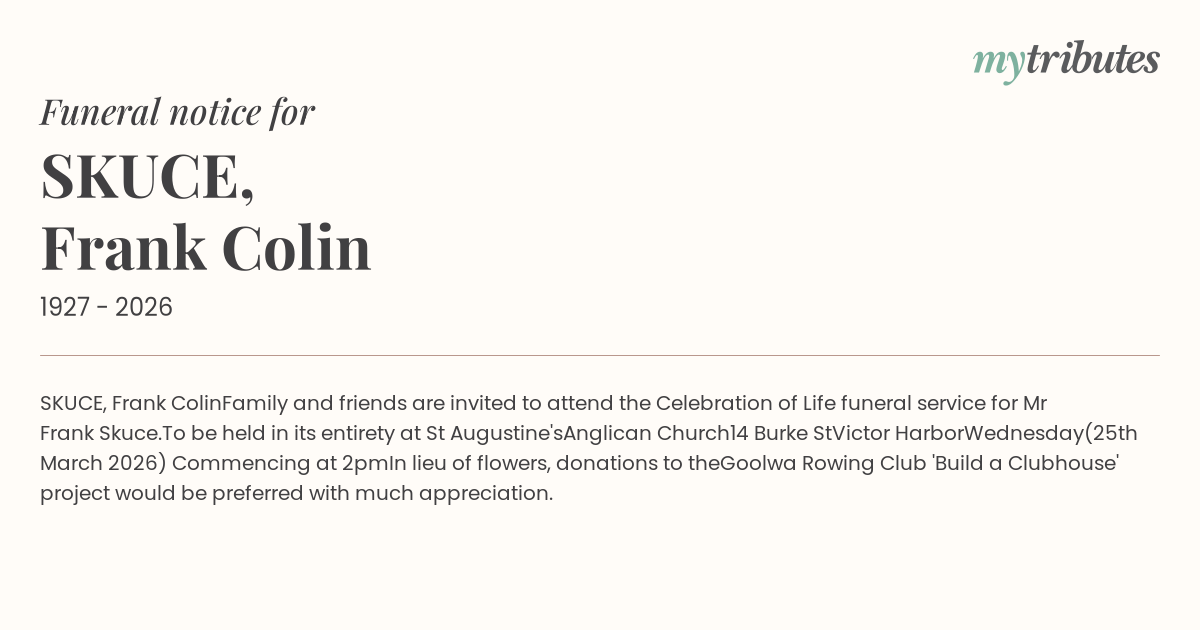 Family and friends are invited to attend the Celebration of Life funeral service for Mr Frank Skuce.
