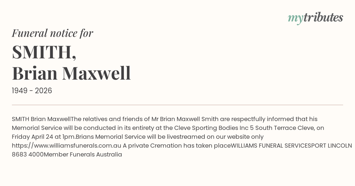 The relatives and friends of Mr Brian Maxwell Smith are respectfully informed that his Memorial Service will be conducted in its entirety at the Cleve Sporting Bodies Inc 5 South Terrace Cleve, on Friday April 24 at 1pm.
