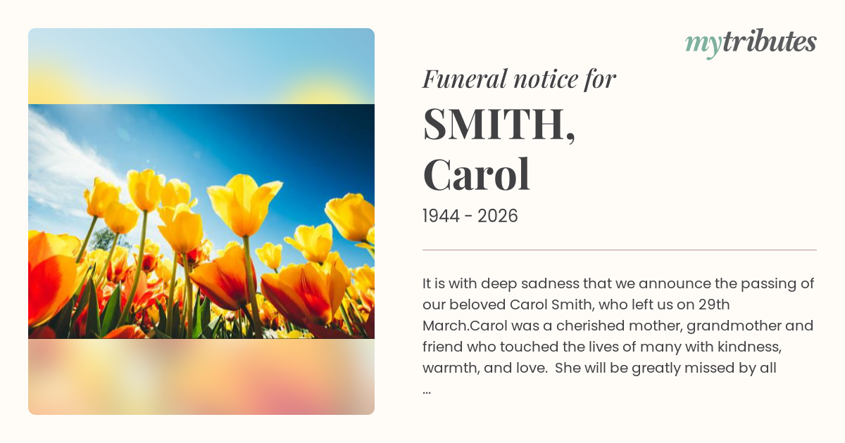18°CIt is with deep sadness that we announce the passing of our beloved Carol Smith, who left us on 29th March.