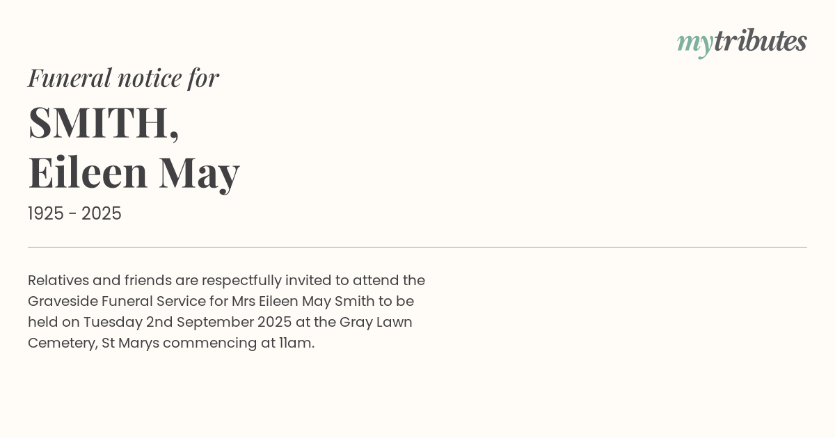 Graveside Funeral Service for Mrs Eileen May Smith to be