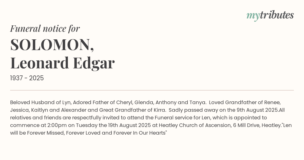 All relatives and friends are respectfully invited to attend the Funeral service for Len, which is appointed to commence at 2:00pm on Tuesday the 19th August 2025 at Heatley Church of Ascension, 6 Mill Drive, Heatley.