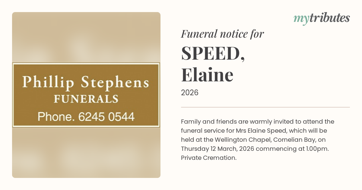 18°CFamily and friends are warmly invited to attend the funeral service for Mrs Elaine Speed, which will be held at the Wellington Chapel, Cornelian Bay, on Thursday 12 March, 2026 commencing at 1.00pm.