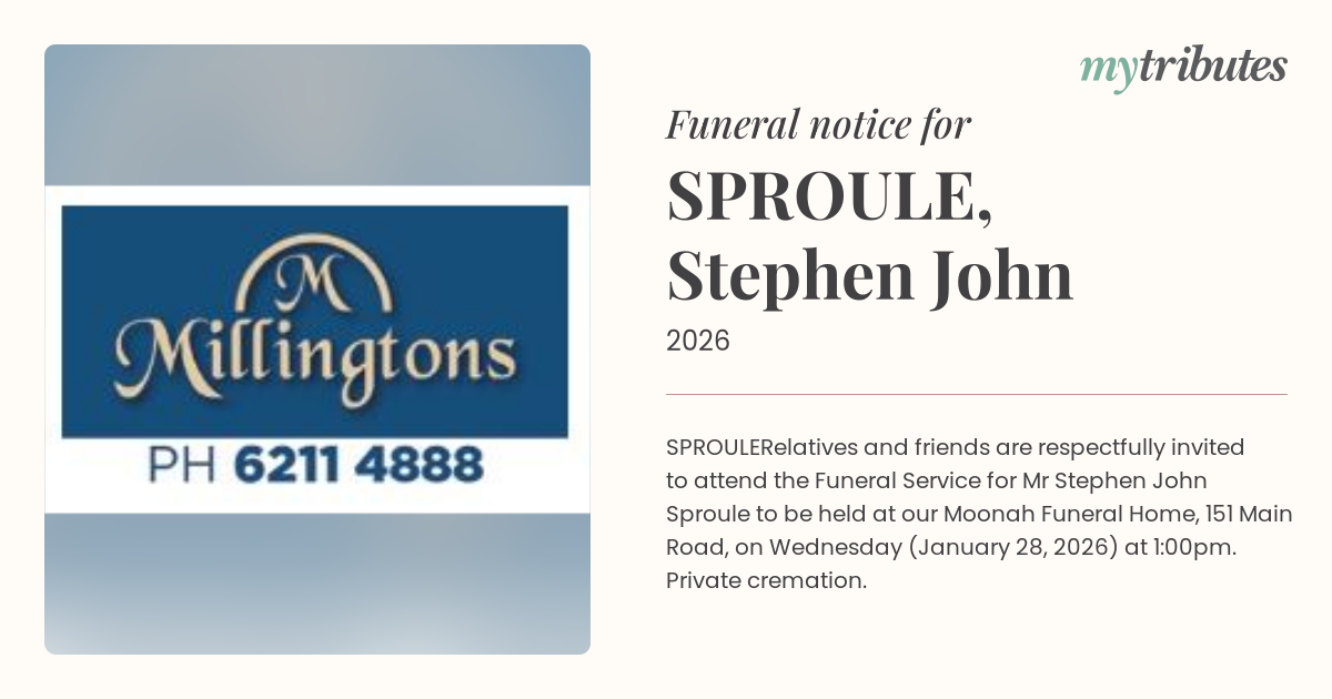 Relatives and friends are respectfully invited to attend the Funeral Service for Mr Stephen John Sproule to be held at our Moonah Funeral Home, 151 Main Road, on Wednesday (January 28, 2026) at 1:00pm.