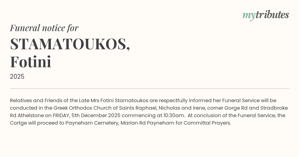 18°CRelatives and Friends of the Late Mrs Fotini Stamatoukos are respectfully informed her Funeral Service will be conducted in the Greek Orthodox Church of Saints Raphael, Nicholas and Irene, corner Gorge Rd and Stradbroke Rd Athelstone on FRIDAY, 5th December 2025 commencing at 10:30am.