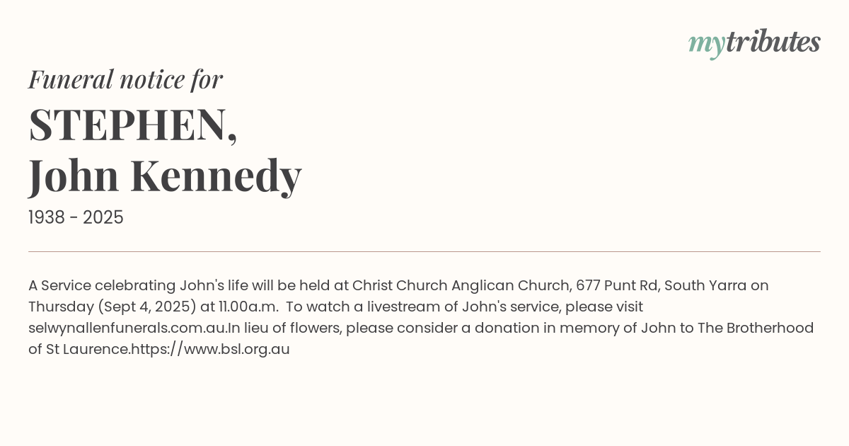18°CA Service celebrating John's life will be held at Christ Church Anglican Church, 677 Punt Rd, South Yarra on Thursday (Sept 4, 2025) at 11.00a.m. To watch a livestream of John's service, please visit selwynallenfunerals.com.au.