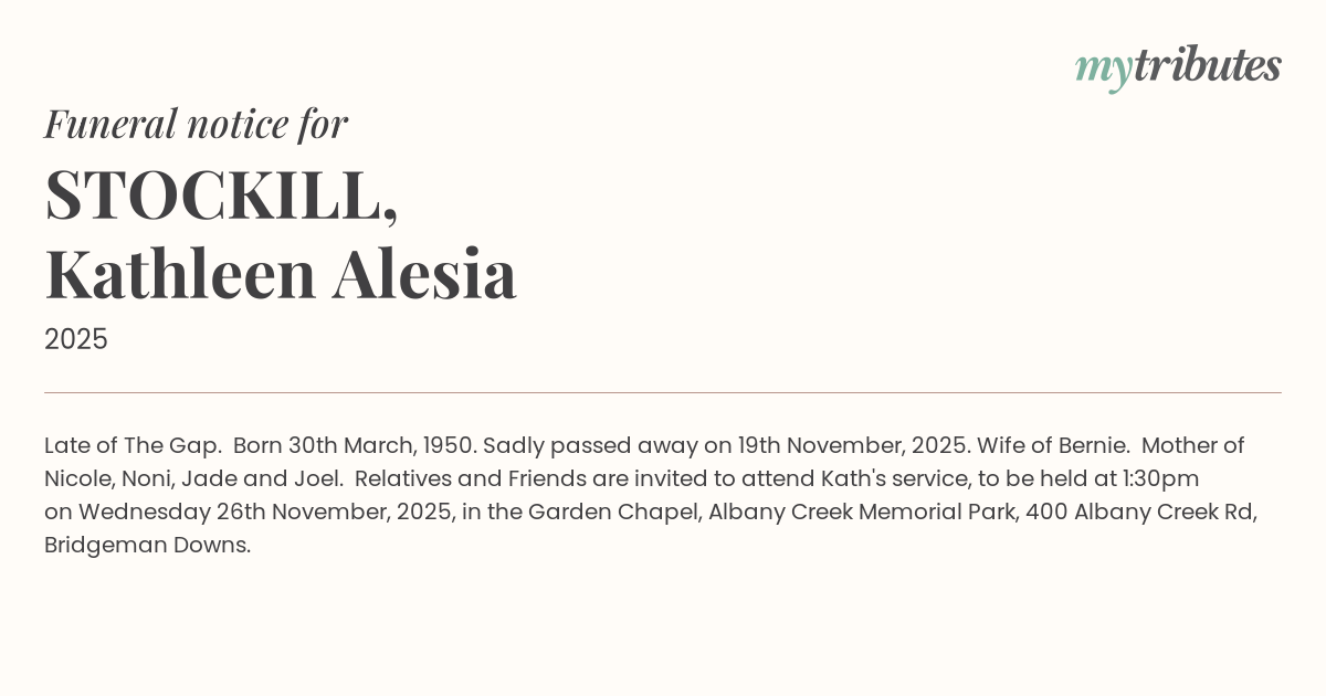 Relatives and Friends are invited to attend Kath's service, to be held at 1:30pm on Wednesday 26th November, 2025, in the Garden Chapel, Albany Creek Memorial Park, 400 Albany Creek Rd, Bridgeman Downs.