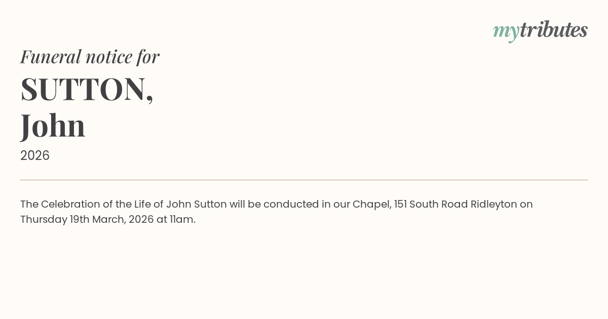 18°CThe Celebration of the Life of John Sutton will be conducted in our Chapel, 151 South Road Ridleyton on Thursday 19th March, 2026 at 11am.