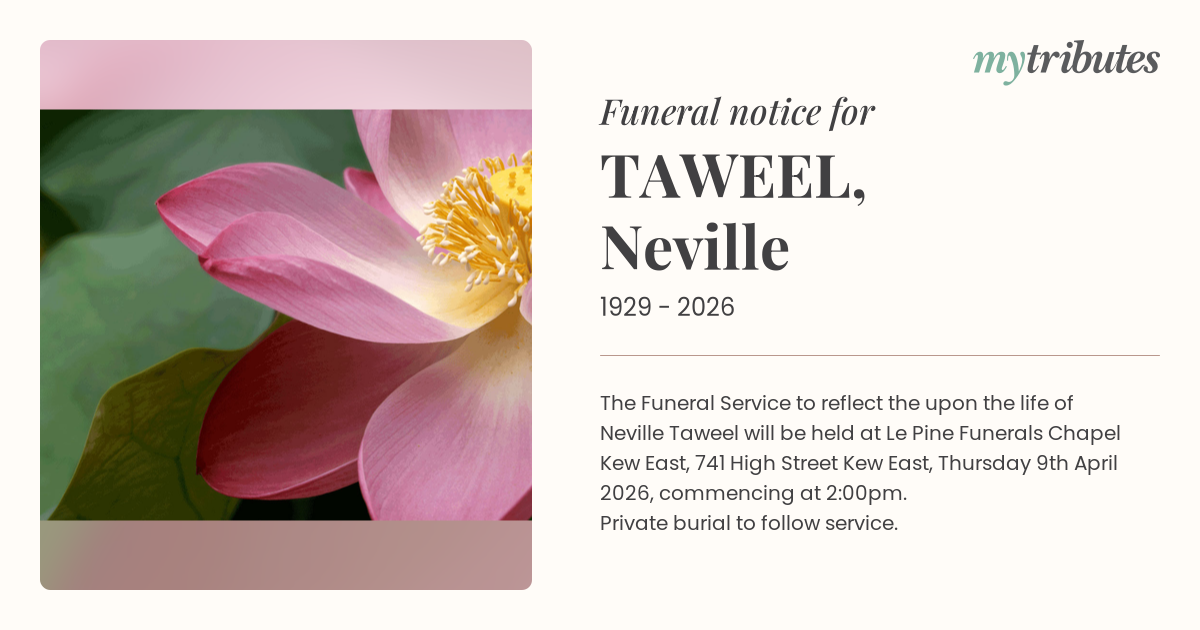 18°CThe Funeral Service to reflect the upon the life of Neville Taweel will be held at Le Pine Funerals Chapel Kew East, 741 High Street Kew East, Thursday 9th April 2026, commencing at 2:00pm.