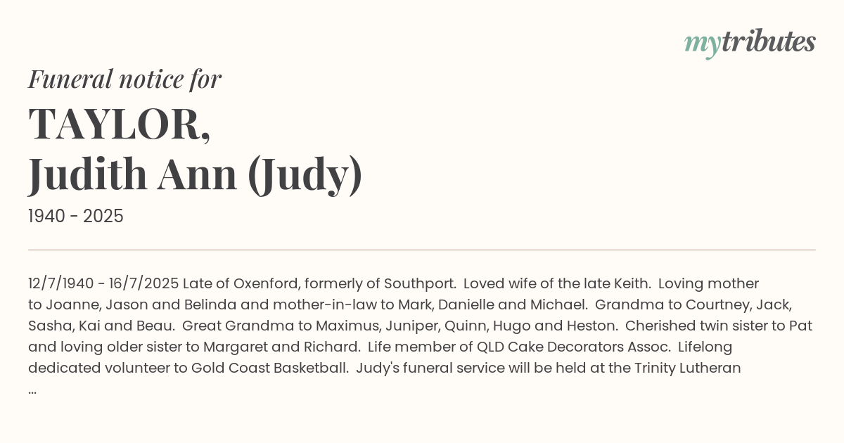 18°C12/7/1940 - 16/7/2025 Late of Oxenford, formerly of Southport. Loved wife of the late Keith. Loving mother to Joanne, Jason and Belinda and mother-in-law to Mark, Danielle and Michael. Grandma to Courtney, Jack, Sasha, Kai and Beau. Great Grandma to Maximus, Juniper, Quinn, Hugo and Heston. Cherished twin sister to Pat and loving older sister to Margaret and Richard. Life member of QLD Cake Decorators Assoc. Lifelong dedicated volunteer to Gold Coast Basketball. Judy's funeral service will be held at the Trinity Lutheran Church, 1 Carey Lane, Southport on Tuesday 29th at 10:00am. Followed by a burial at Allambe Memorial Park.