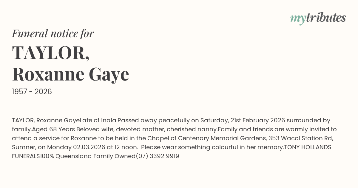 Centenary Memorial Gardens, 353 Wacol Station Rd, Sumner, on Monday 02.03.2026 at 12 noon.