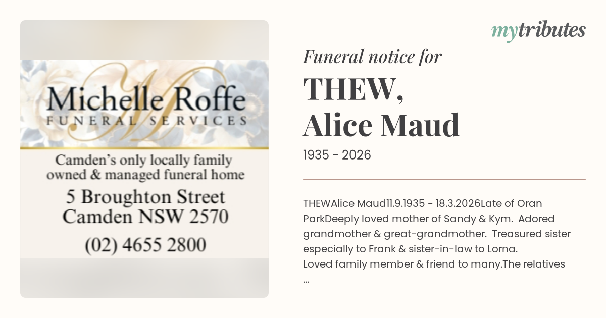The relatives and friends of Alice are kindly invited to attend her Funeral Service to be held on Thursday 26th March 2026 at St Paul's Catholic Church, Camden commencing at 10:30am.