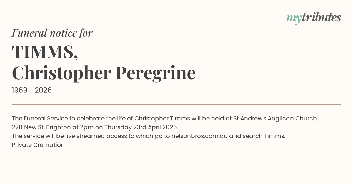 The Funeral Service to celebrate the life of Christopher Timms will be held at St Andrew's Anglican Church, 228 New St, Brighton at 2pm on Thursday 23rd April 2026.