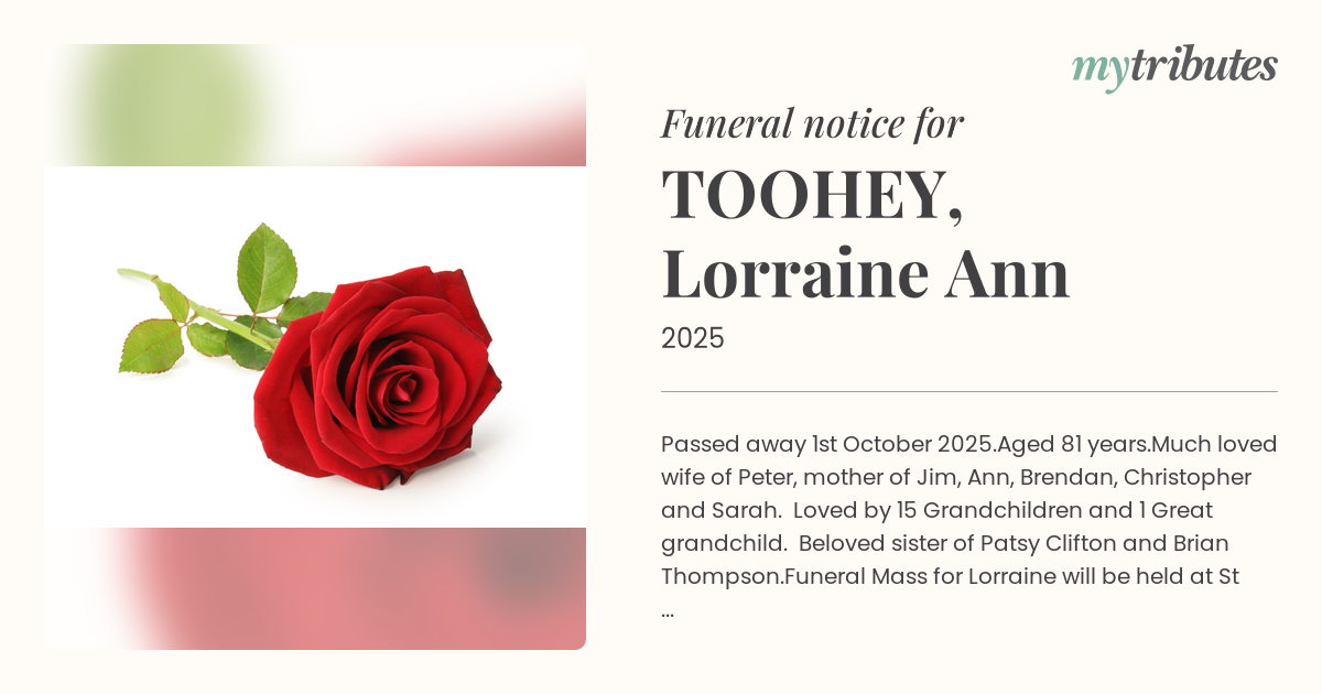 Funeral Mass for Lorraine will be held at St Gerard's Majella Catholic Church, 146 Maundrell Terrace, Chermside West, on Wednesday 8th October, at 10 a.m., followed by a private cremation.