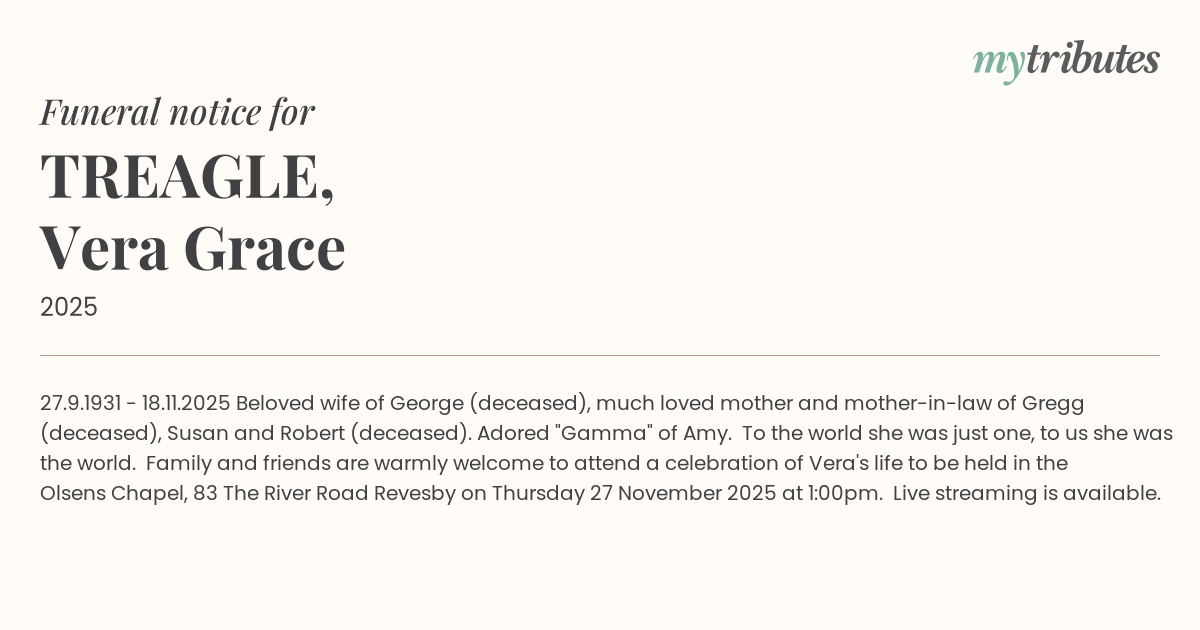 Family and friends are warmly welcome to attend a celebration of Vera's life to be held in the Olsens Chapel, 83 The River Road Revesby on Thursday 27 November 2025 at 1:00pm. Live streaming is available.