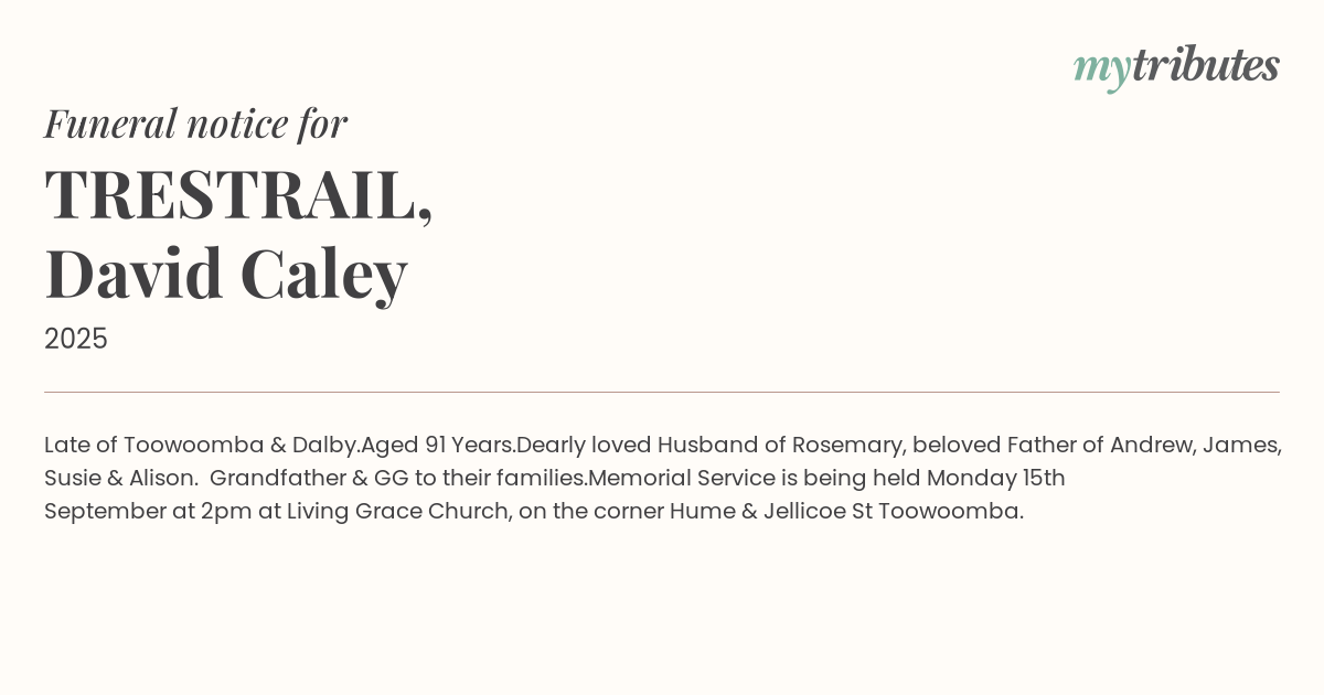 Memorial Service is being held Monday 15th September at 2pm at Living Grace Church, on the corner Hume & Jellicoe St Toowoomba.