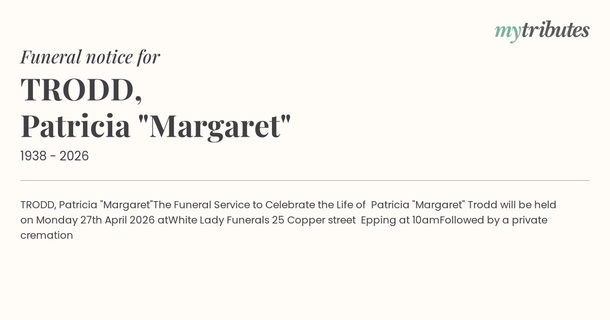 The Funeral Service to Celebrate the Life of Patricia "Margaret" Trodd will be held on Monday 27th April 2026 at