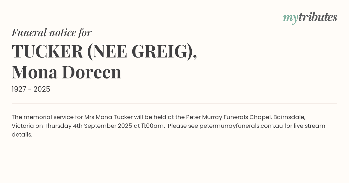 18°CThe memorial service for Mrs Mona Tucker will be held at the Peter Murray Funerals Chapel, Bairnsdale, Victoria on Thursday 4th September 2025 at 11:00am. Please see petermurrayfunerals.com.au for live stream details.