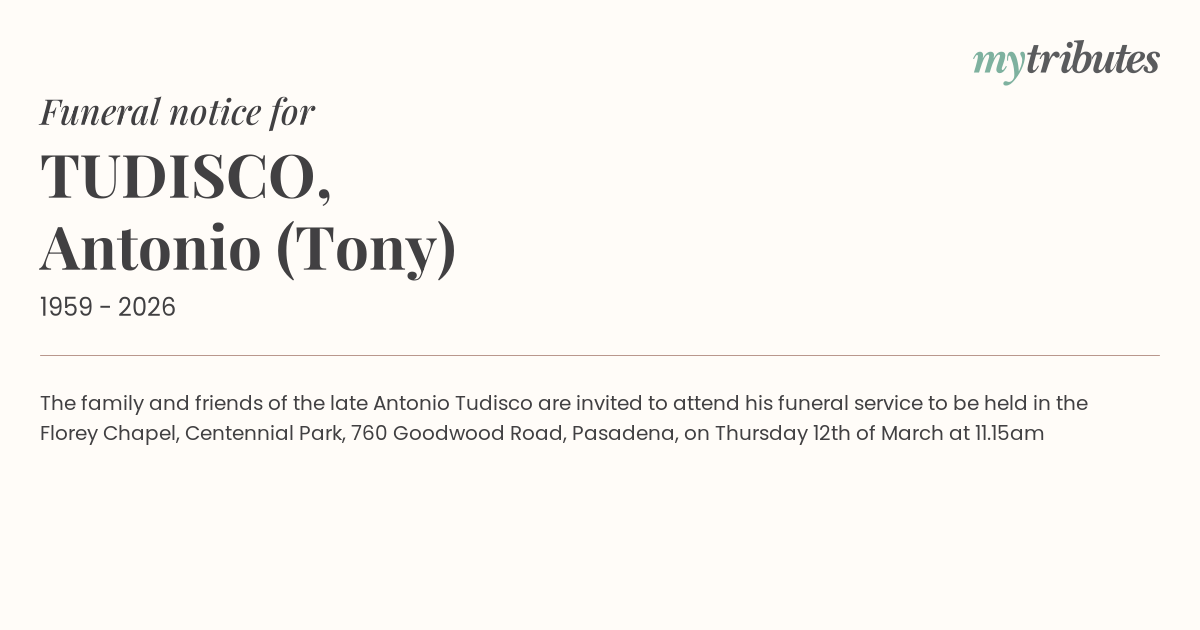 18°CThe family and friends of the late Antonio Tudisco are invited to attend his funeral service to be held in the Florey Chapel, Centennial Park, 760 Goodwood Road, Pasadena, on Thursday 12th of March at 11.15am