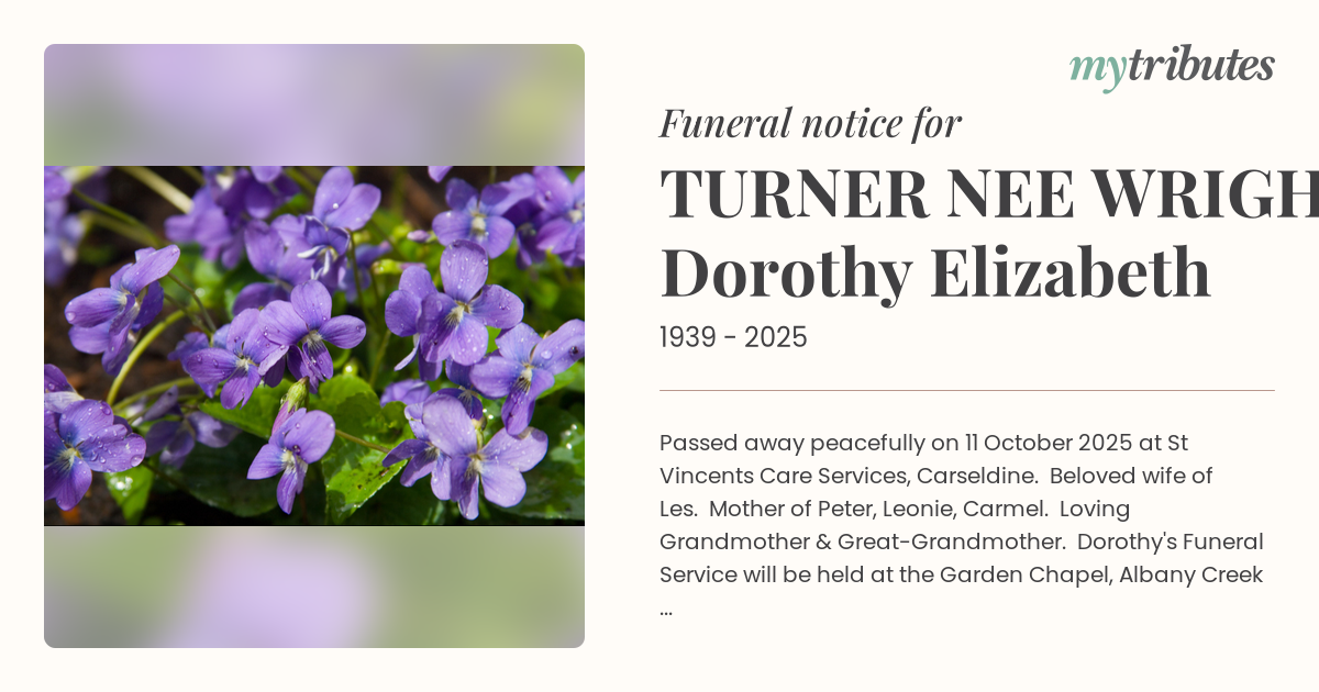 18°CPassed away peacefully on 11 October 2025 at St Vincents Care Services, Carseldine. Beloved wife of Les. Mother of Peter, Leonie, Carmel. Loving Grandmother & Great-Grandmother. Dorothy's Funeral Service will be held at the Garden Chapel, Albany Creek Memorial Park 400 Albany Creek Road, BRIDGEMAN DOWNS Queensland 4035. On Wednesday, 22 October 2025 at 10:30am. Please wear something bright and colourful. In lieu of flowers, donations may be made to Dementia Australia, The Heart Foundation, or Diabetes Australia.