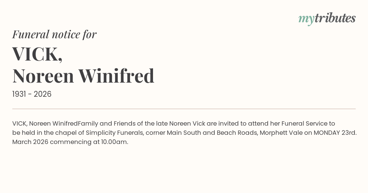 Family and Friends of the late Noreen Vick are invited to attend her Funeral Service to be held in the chapel of Simplicity Funerals, corner Main South and Beach Roads, Morphett Vale on MONDAY 23rd. March 2026 commencing at 10.00am.