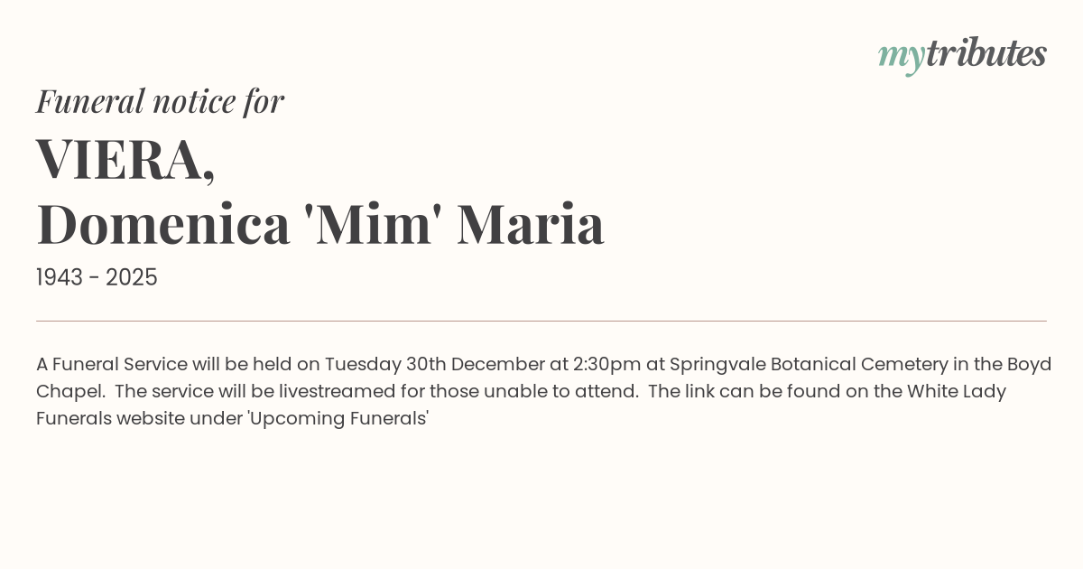 18°CA Funeral Service will be held on Tuesday 30th December at 2:30pm at Springvale Botanical Cemetery in the Boyd Chapel. The service will be livestreamed for those unable to attend. The link can be found on the White Lady Funerals website under 'Upcoming Funerals'