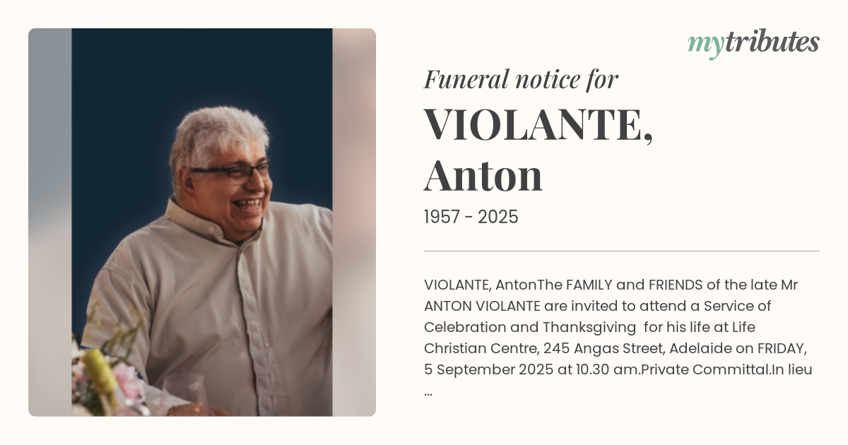 The FAMILY and FRIENDS of the late Mr ANTON VIOLANTE are invited to attend a Service of Celebration and Thanksgiving for his life at Life Christian Centre, 245 Angas Street, Adelaide on FRIDAY, 5 September 2025 at 10.30 am.